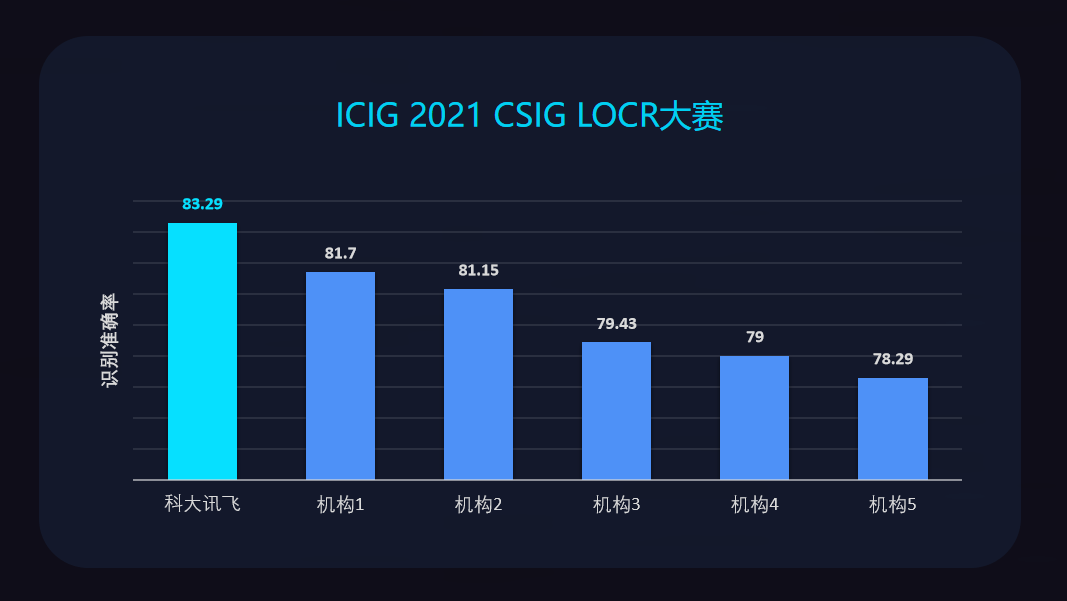 在2021年輕量級文字識別技術(shù)創(chuàng)新大賽(Lightweight Optical Character Recognition, 簡稱LOCR)中,科大訊飛以復(fù)雜自然場景83.29%的整句正確率,取得第一名。