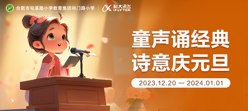 為深入學習宣傳貫徹黨的二十大精神,全面貫徹黨的教育方針,落實立德樹人根本任務,以閱讀啟迪智慧、引領(lǐng)成長,進一步推進書香校園建設,合肥市屯溪路小學教育集團祁門路小學聯(lián)合科大訊飛AI朗讀亭小程序于2023年12月20日開展“童聲誦經(jīng)典,詩意慶元旦”線上朗讀活動。